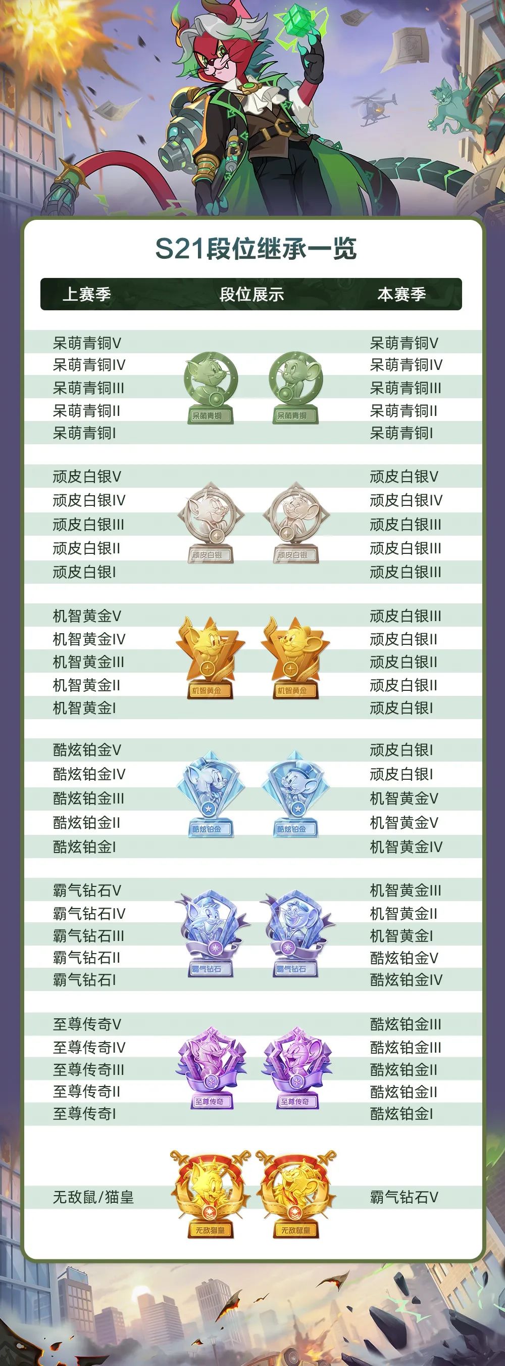 “2024年7月12日S21赛季”开启后,将会根据继承规则对小伙伴们“S20赛季”的段位进行降级继承,具体继承规则详情如下图,大家也可以前往游戏内精灵或官方平台查询。
