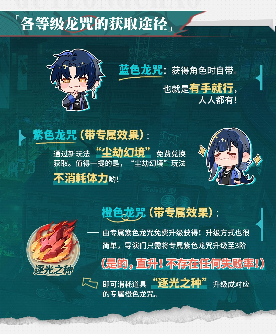 后续紫色、橙色龙咒均可免费获得,甚至可以用素材精准自选,也就是说,导演们在获得心仪角色后,再也不用担心歪龙咒了,统统稳定获得。