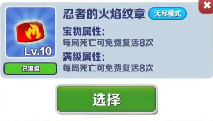 首先是忍者的火焰纹章,由于地铁跑酷存在特殊的无限复活机制,每次复活,钥匙的数量,都是成倍叠加的,所以即使你钥匙再多,到后面也根本扛不住,但如果装备上忍者的火焰纹章,每局就可以免费复活八次,一局能省下255个钥匙。