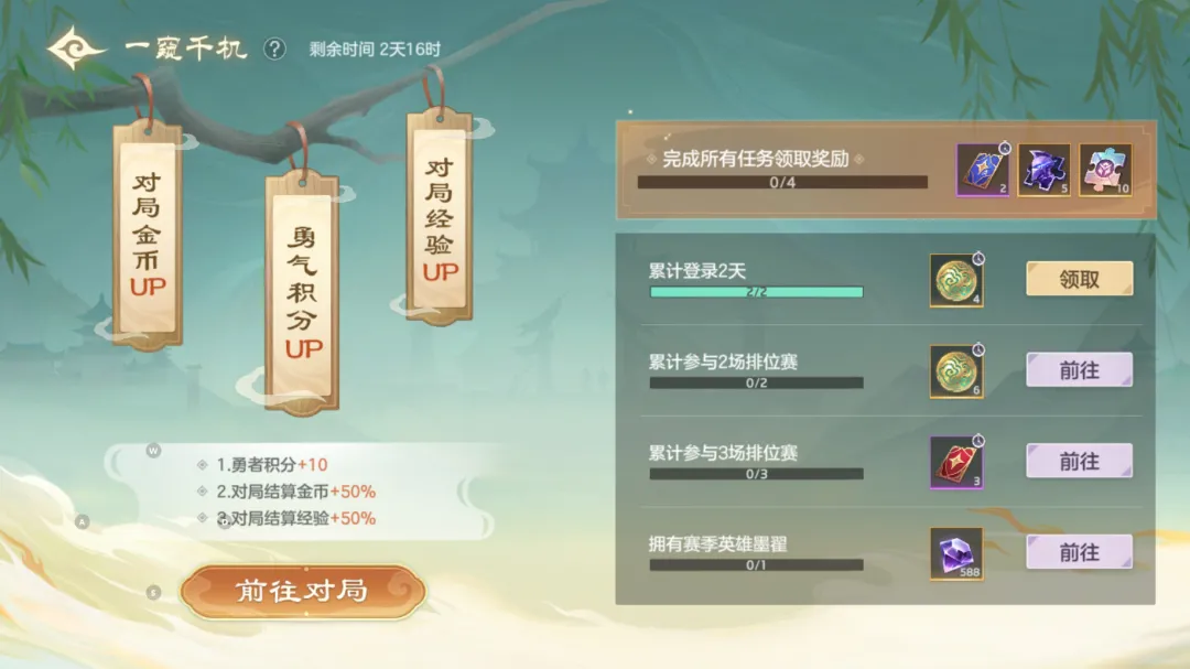 勇者积分+10,对局结算金币+50%,对局结算经验+50%,完成任务可获得玲珑心、排位守护卡等奖励