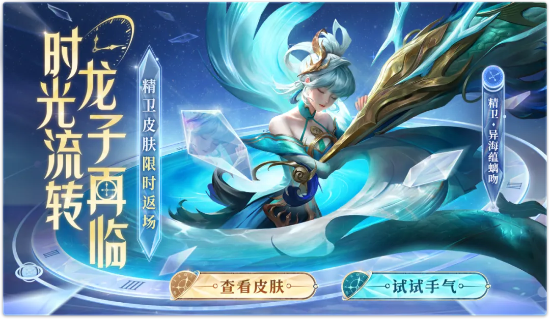 部分皮肤抽取概率UP,限时抽取星光限定精卫·异海蕴螭吻;在活动界面消耗礼券进行时光盲盒抽奖。10次抽奖(含10次)内可必得随机品质皮肤奖励,80次抽奖(含80次)内可必得传说及以上品质皮肤奖励。