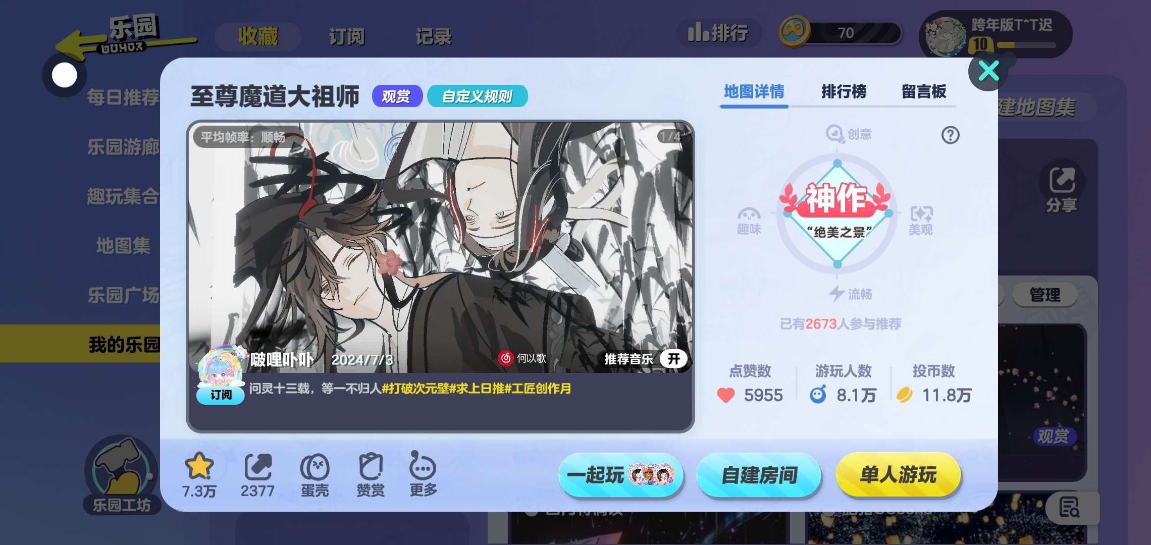 该地图选自小说作家墨香铜臭出版的小说《魔道祖师》超级推荐这部小说!很好看ʕ ᵔᴥᵔ ʔ “忘羡一曲远 曲终人不散”为遇一人而入红尘,人去我亦去,此身不留尘 我想带一个人回云深不知处,带回去,藏起来 真的把蓝忘机和魏无羡做的超级细节和逼真 已经狠狠的爱上这个地图了ʕ ᵔᴥᵔ ʔ 地图人物做的很细节