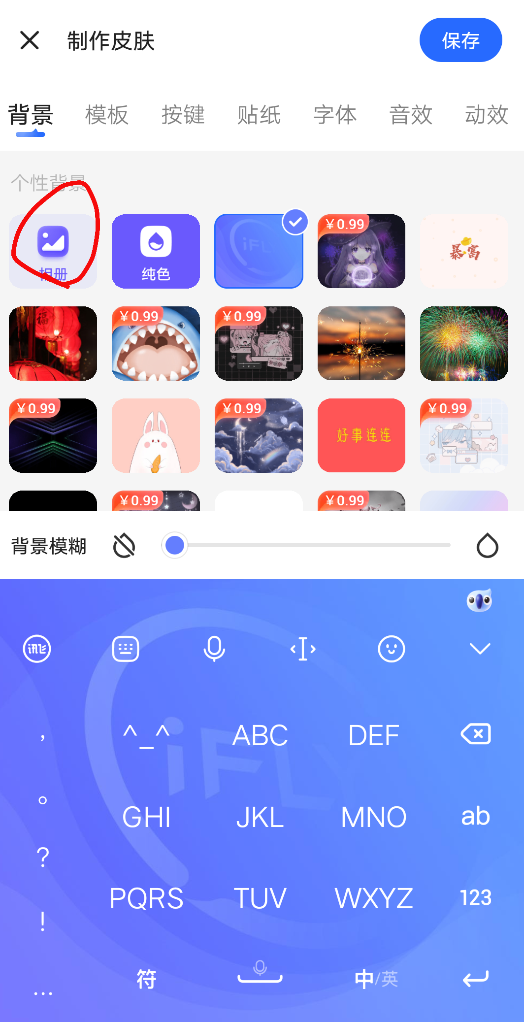打开图贴纸或导入图片选择你喜欢的放入键盘。。。注意不要挡住字母。。。。