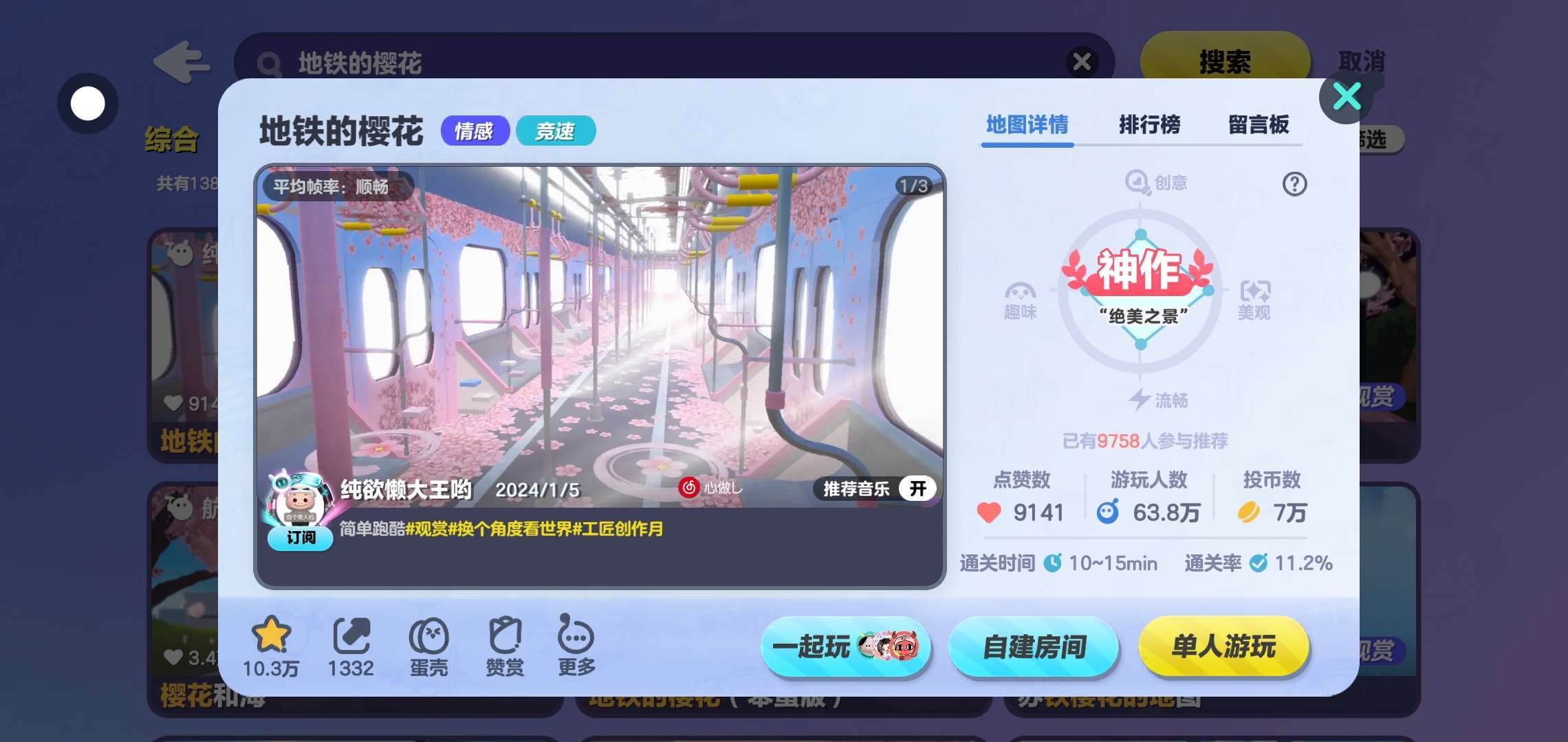 左边通关 右边铁蛋 这个地图是一个超级好看的烟花跑酷地图 在跑图的过程中可以一边的欣赏风景 还可以一边跑图 真的巨好看!(=^▽^=) 地铁的樱花 这个名字取的也非常棒 场景也是非常的美(=^▽^=) 这边一共有两个跑酷 左边一个 右边一个 可以叫上蛋搭子一起去游玩 或者比个赛!看谁第一个跑到终点!非常的有趣⌓‿⌓ 跑酷难度不是很大 也是非常的适合新手宝子们 超级欢迎大家去玩!ʕ ᵔᴥᵔ ʔ