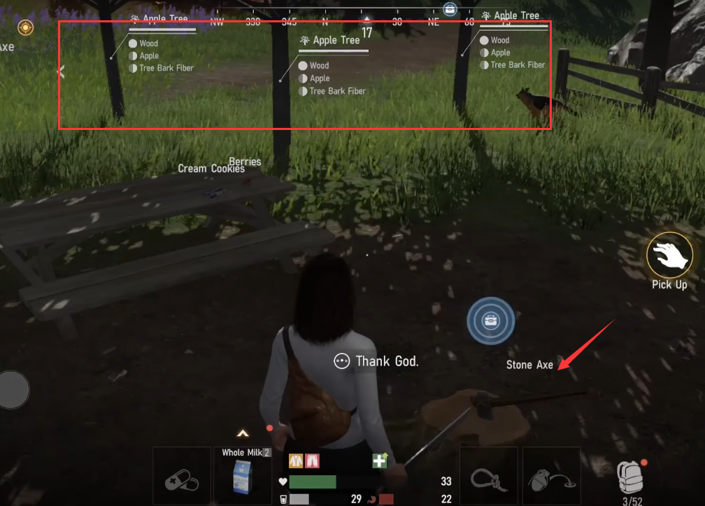 其二是引导式设计。这款游戏没有传统意义上的手游教程,不会强制玩家做某些任务,或者教会某些操作。更多的时候,游戏是用一些符合生存本能的引导式设计,让玩家自然而然熟悉游戏基本操作的,比如先用地形引导你的前进方向,再于路途中先后放置一把刀和一波野怪,或者一把斧头和一排树,那么玩家自然而然会尝试使用武器或工具。