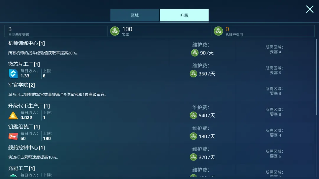 不同建筑所需的解锁条件与日常维护费用均有不同,要塞达到6以后即可建造修船厂,获取飞船碎片,指挥官根据派系发展方向选择建造和升级的方案,打造星际中最强大的派系。