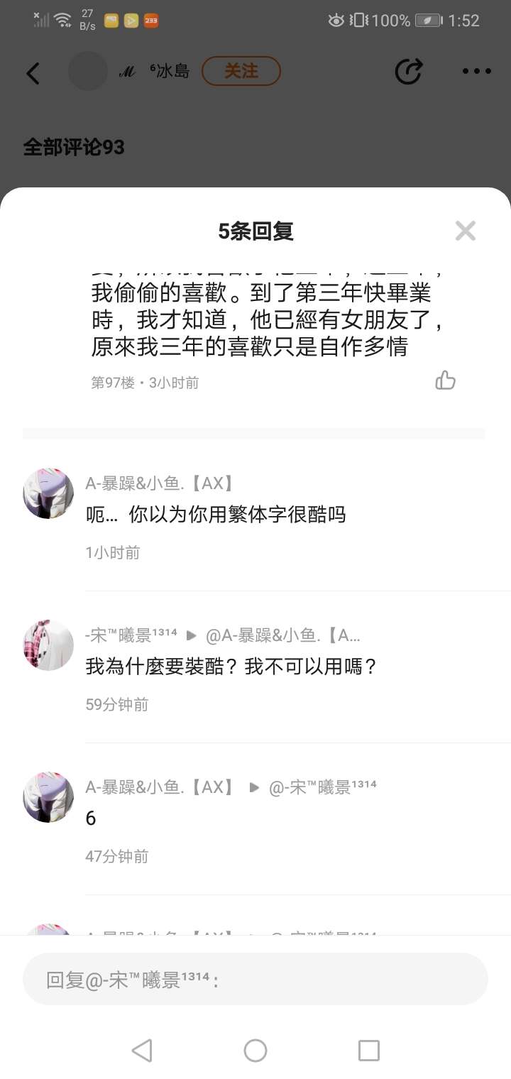 现在的网络真是我小看了,我用个繁体字都要被管,难不成我还不能用了?那繁体字不用不就在那当个摆设吗?这些管字体,名字,帖子,头像,什么的人太小心眼了,我好怕怕啊,以后繁体字都要被人管了?我不能用了,那我用什么?用简体?简体就只能用这一种,这些人真是心胸狭隘。