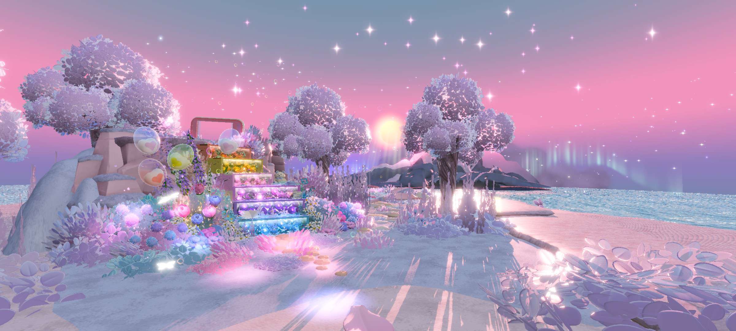 谁懂这张图的含金量!!😍🕸️那五颜六色的台阶上闪闪发光✨星星撒满夜空 像一颗颗闪闪发光的珍珠🕸️那棵树宛如一片紫色的海洋令人陶醉于此💘这些五颜六色的气球🎈 飘在天空中 让人们仿佛进入了一个童话世界💞