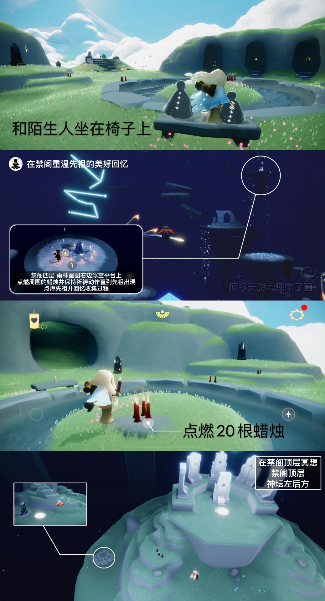 「在禁阁重温先祖的美好回忆」禁阁四层,雨林星图右边浮空平台上。需点燃蜡烛摆出祈祷动作直到中间石碑完全变白,然后重温出现的先祖的收集过程