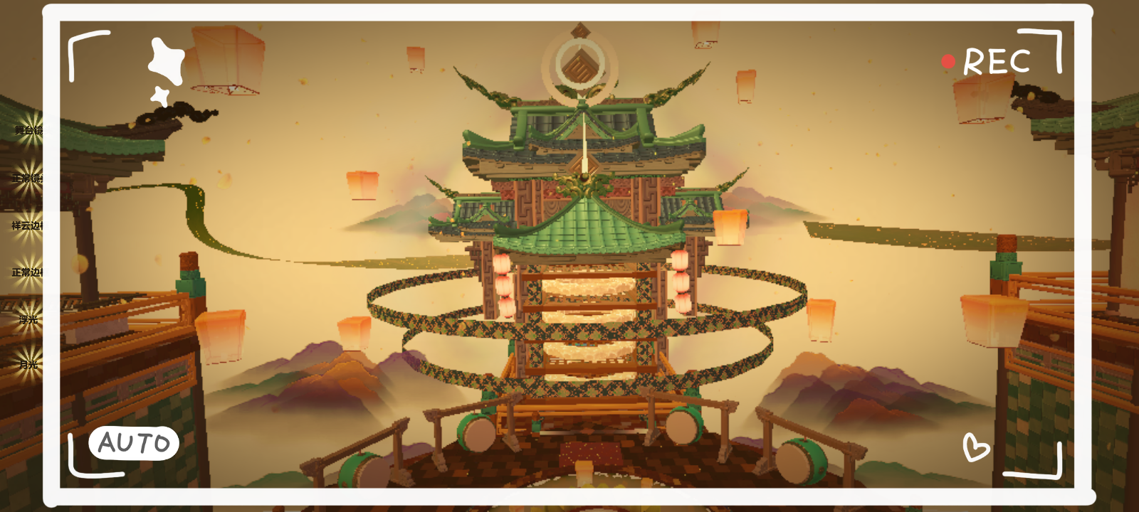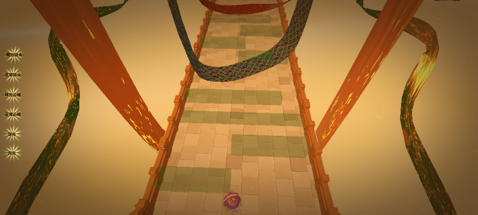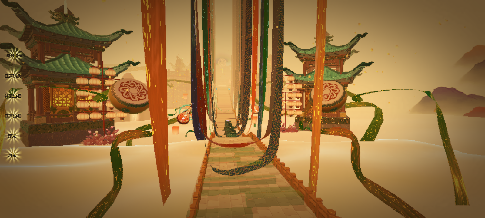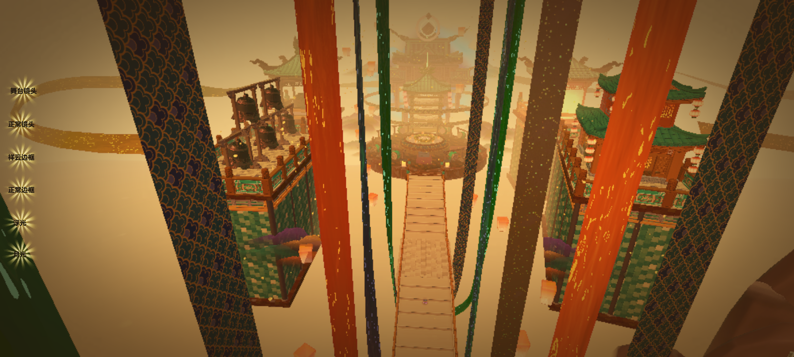 往前再走,中间一个圆形地基,正前方有一座宫殿,宫殿四周环绕着两圈丝绸,不停的转动着,周围整个天空都是孔明灯