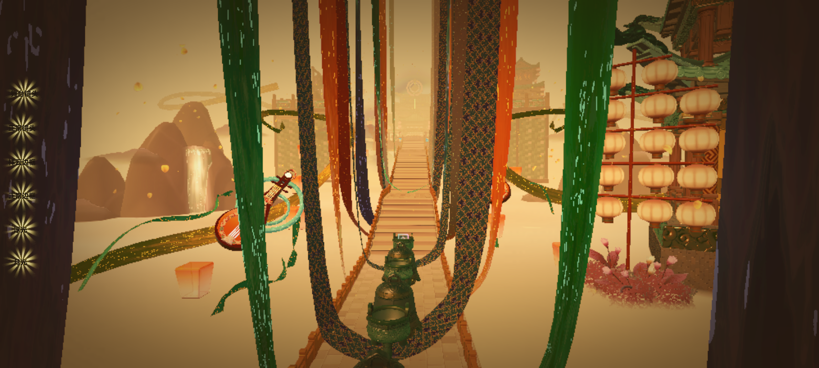 躲完销毁,我们要往钟上一走这古老的钟啊!似乎一走就会发出“咚咚咚”的声音,像是在唤醒某种庞然大物,瞧!桥旁边还有孔明灯还有一把琵琶,琵琶上还缠着绿丝绸这绿丝绸,似乎是想带着这琵琶往前行走,或是为这琵琶平添一抹装饰