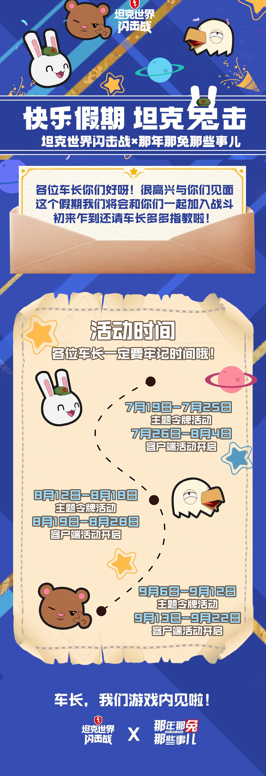 这个快乐暑假,让梦幻联动的快乐,就在大炮的射程之内!欢迎车长们点击下方活动长图,快速标记联动时间,准时开火,精准“兔击”!