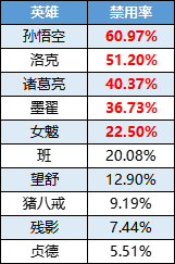 【禁用率前五】孙悟空、洛克、诸葛亮、墨翟、女魃