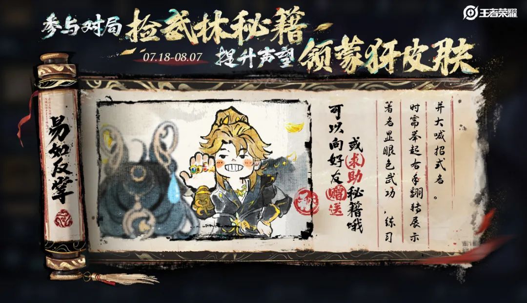 ◆玩法介绍:活动期间,玩家参与5v5匹配或排位时,每一局可在高地外捡拾1本随机武林秘籍,在对局中触发高光时,可额外再获取一本秘籍,直到达到当日收集上限。收集一定数量的秘籍,将大幅加速在江湖悬赏活动中领取新史诗皮肤蒙犽-顽岩魄的进度!