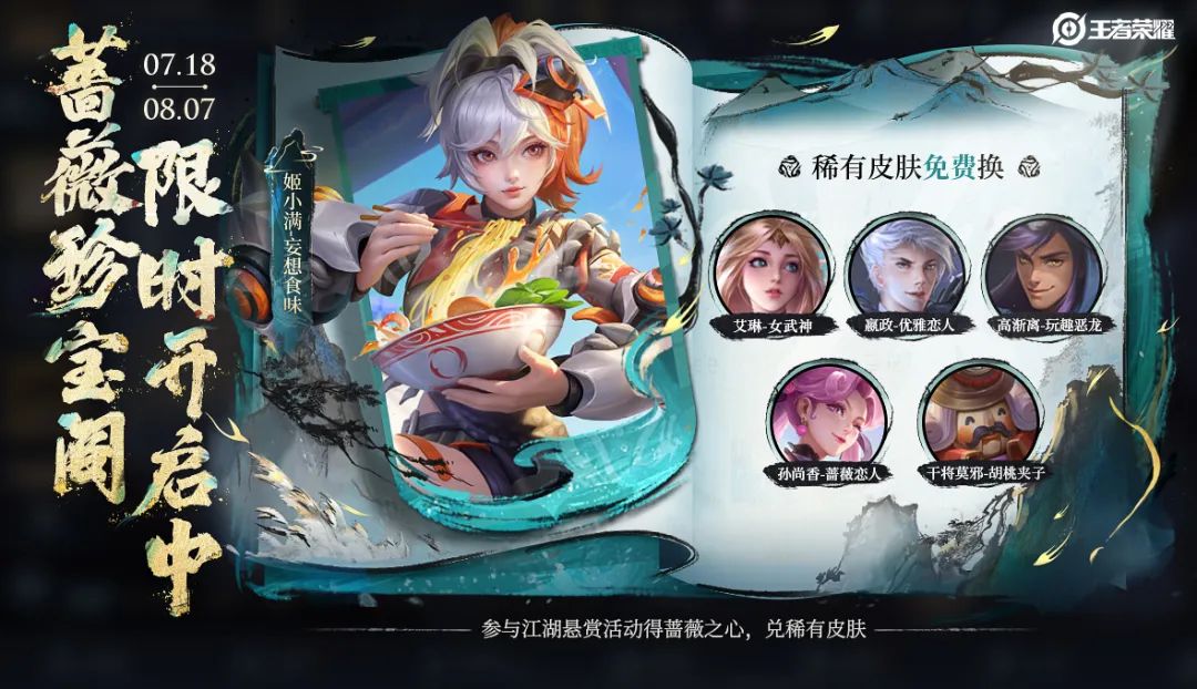 ◆玩法介绍:活动期间,玩家可前往江湖悬赏活动完成任务获得蔷薇之心,蔷薇之心可用于兑换蔷薇珍宝阁专属稀有皮肤。