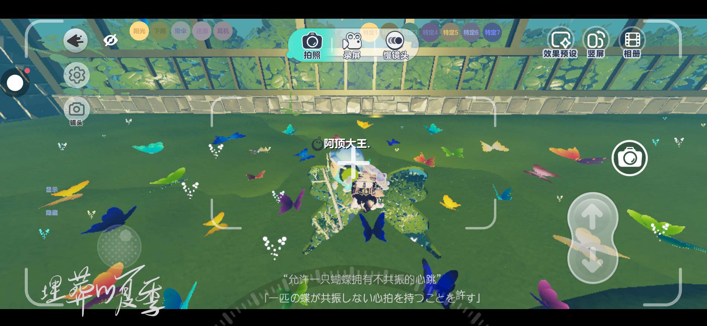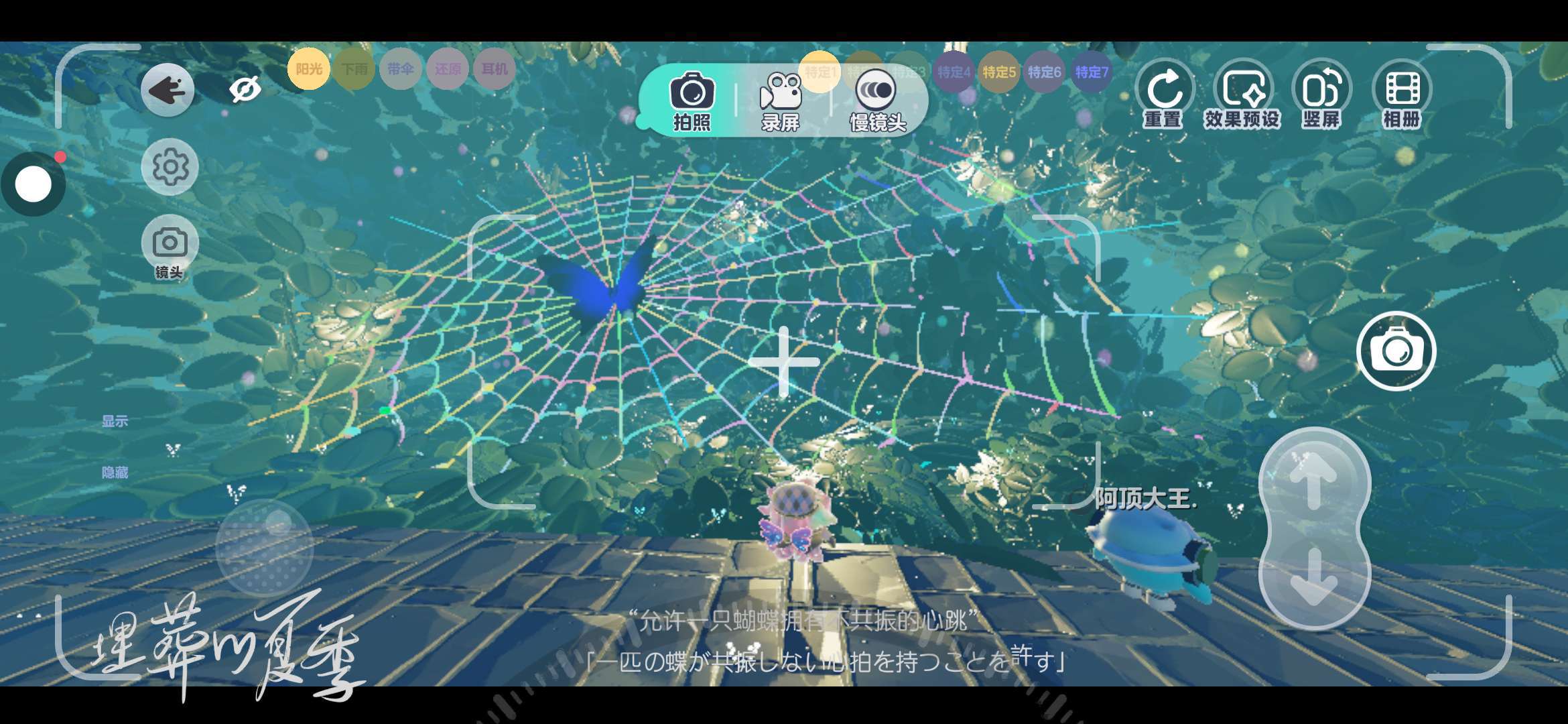 一个巨大的五彩缤纷的网蝴蝶,站在正中央四周,还有很多发光的小草,发光的花朵什么的就是非常推荐到了这又换了一个文案,不得不说这文案变换的是真的好看,反正这文案很绝