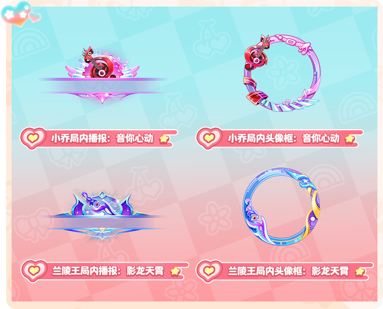 7月20日-8月9日,参与峡谷璀璨秀活动,获取联动时装,拥有时装音你心动 小乔即可获得,小乔局内播报和局内头像框。拥有时装影龙天霄 兰陵王即可获得,兰陵王局内播报和局内头像框!