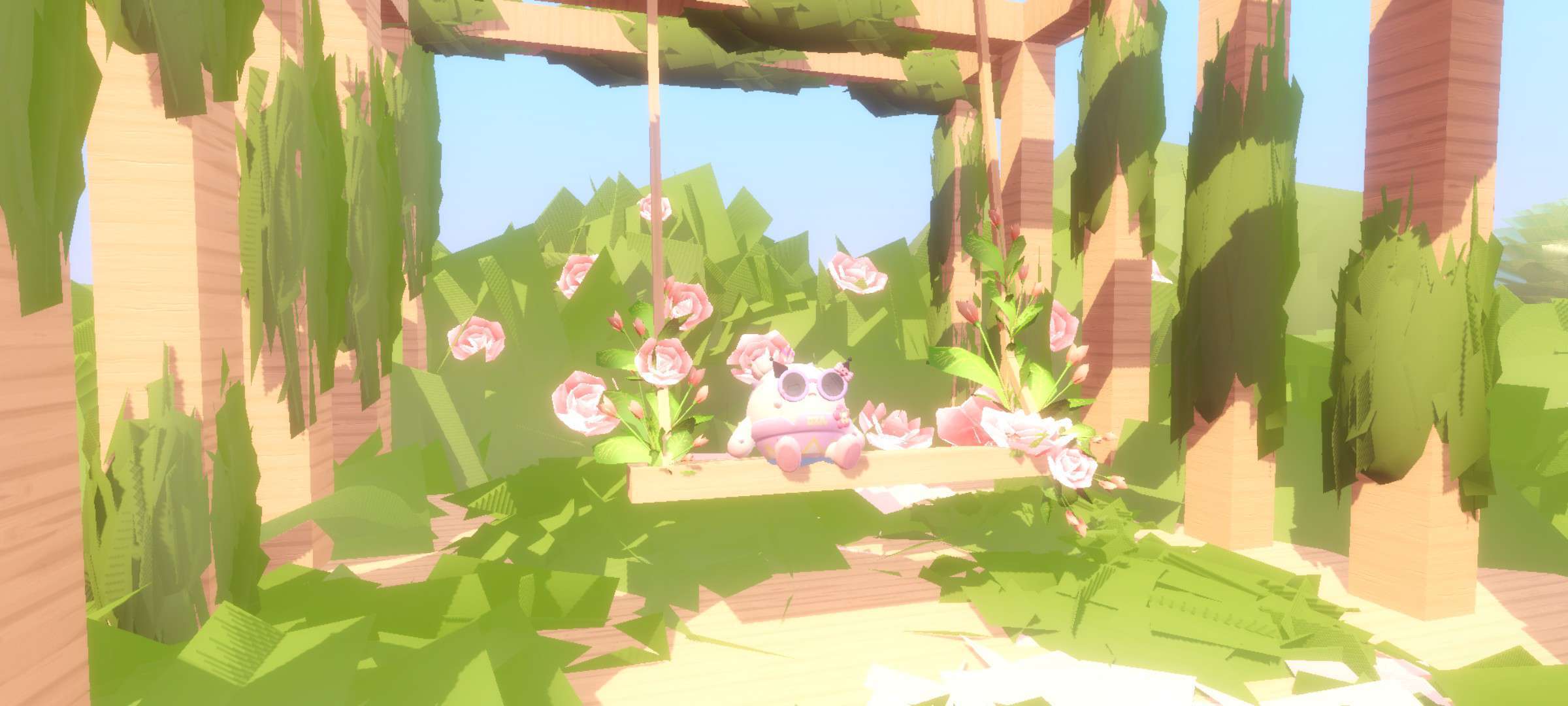 最后一个场景就是秋千啦!秋千背后也是有蔷薇花,进行点缀 边上的柱子也有苔藓做点缀相称