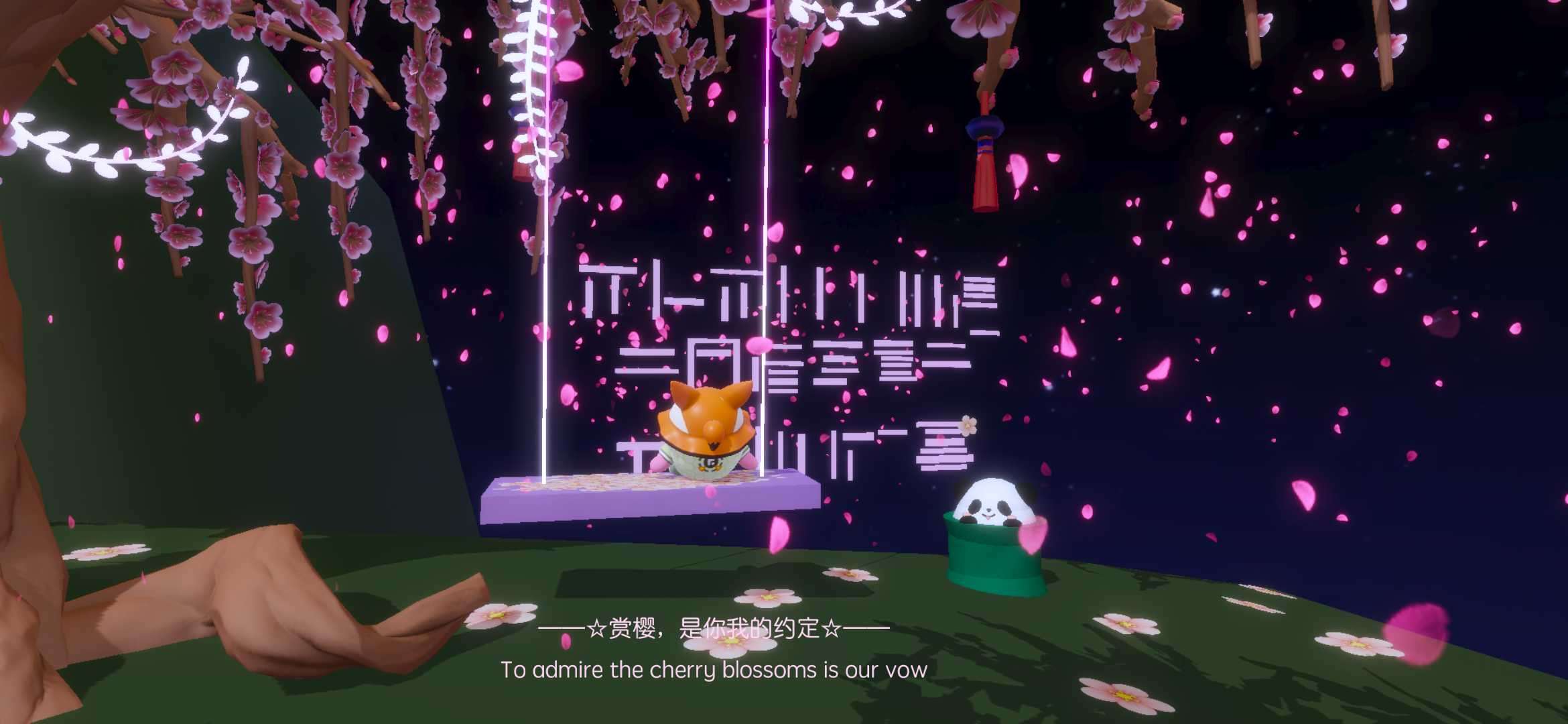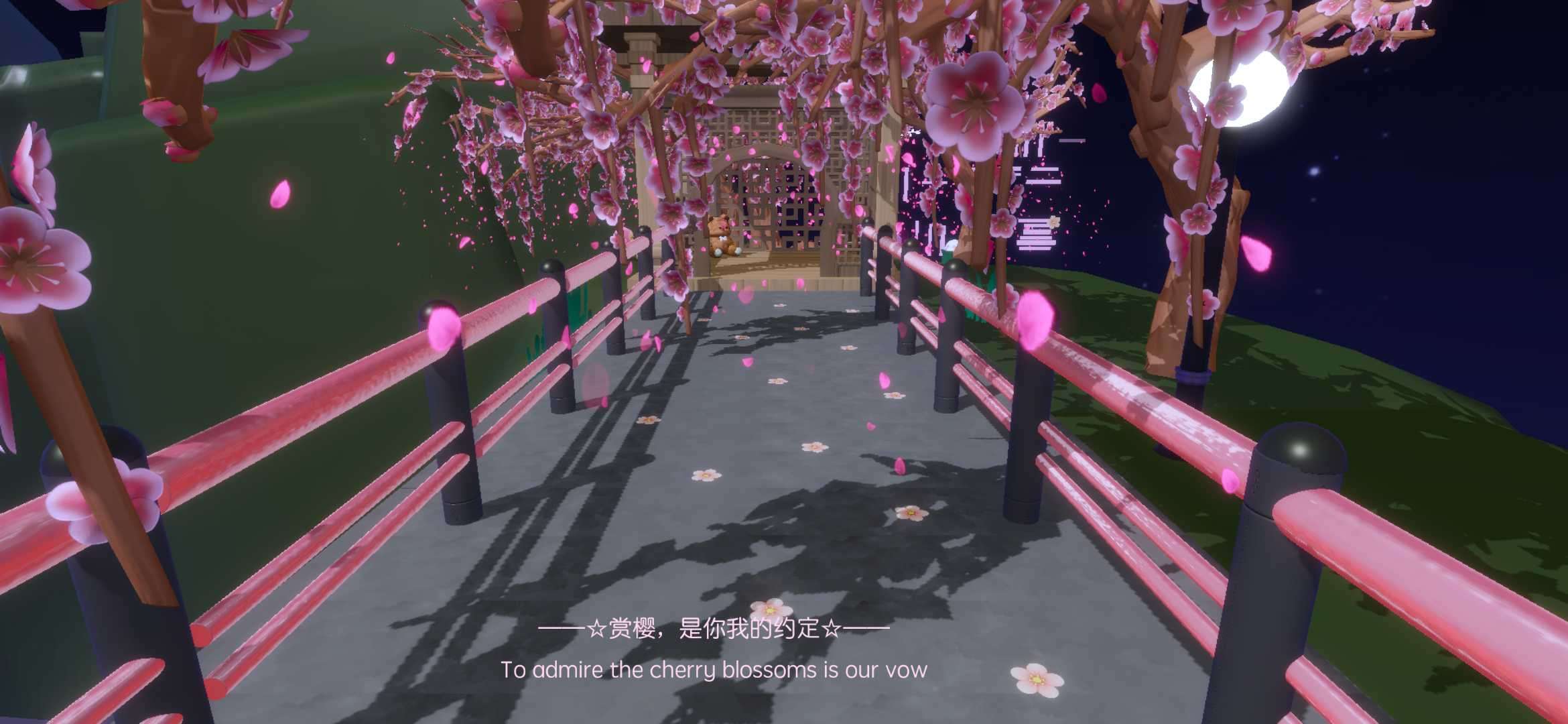 走廊的尽头是一个亭子,一只可爱的小熊静静的坐在那里好似在等待玩家们的到来,就像“我定思君拼瘦损,君不思兮可奈何。”——辛弃疾《破阵子•赠行》