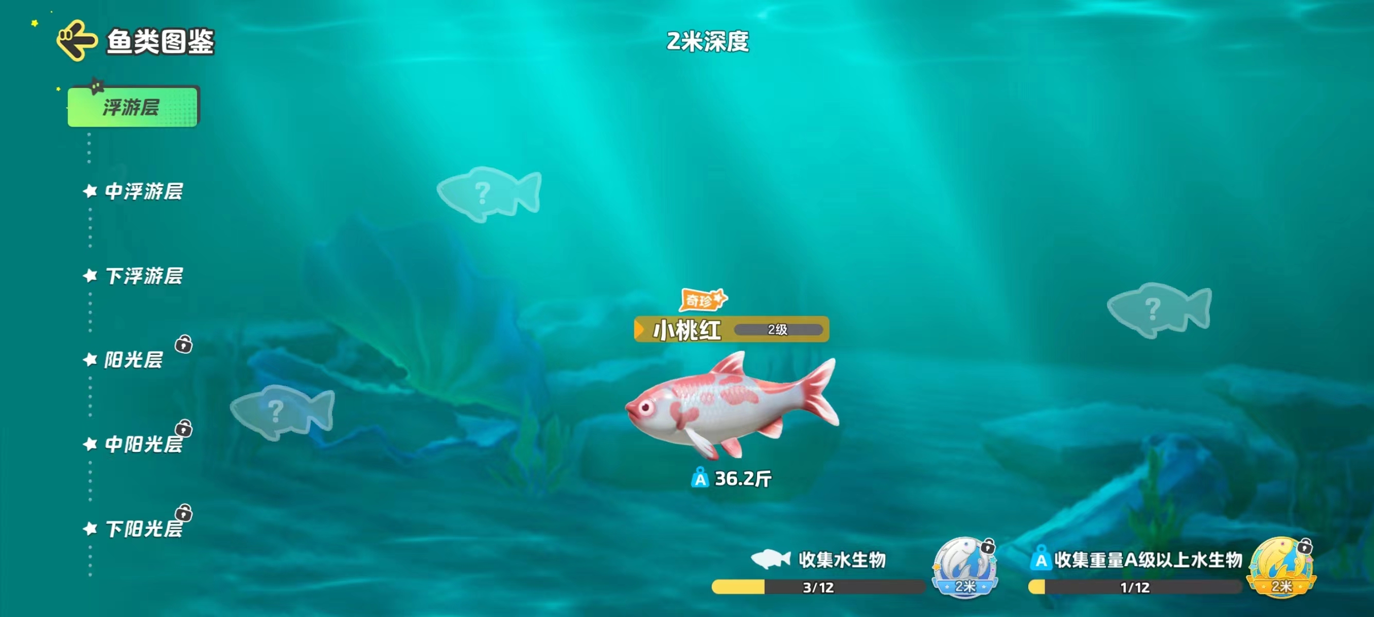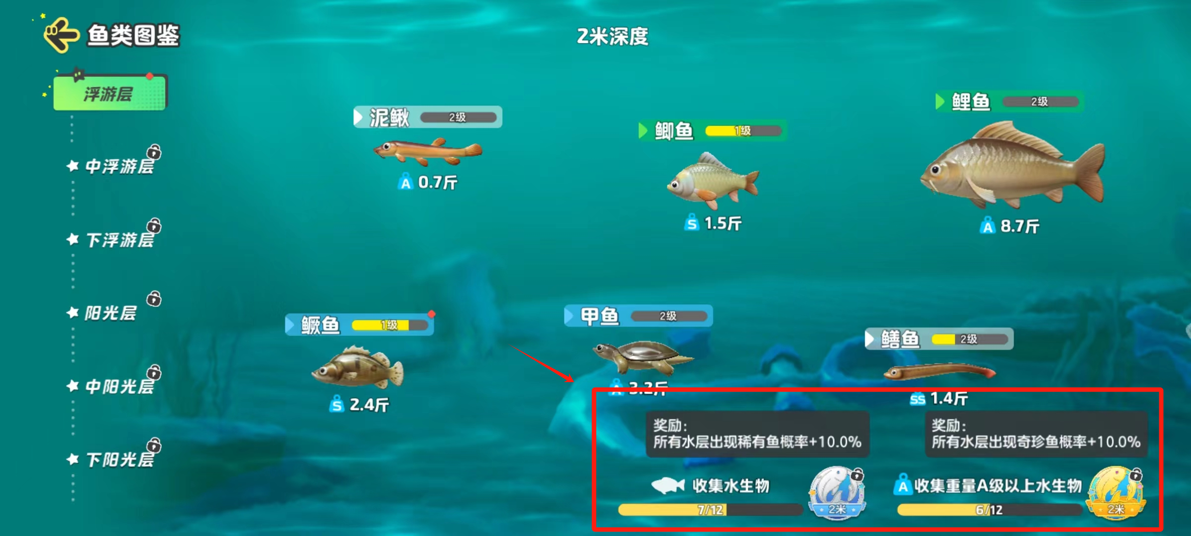 那么前期经营鱼塘,究竟怎样才能发家致富呢?星妹建议星宝们可以尝试,把浮游层(2米)“钓”到通关,稳固基础!