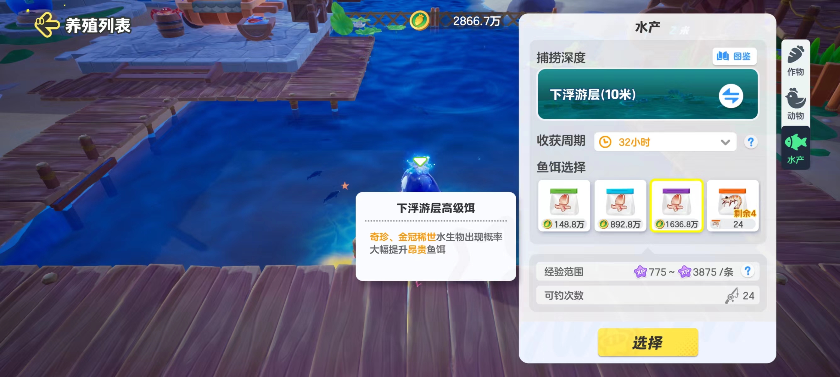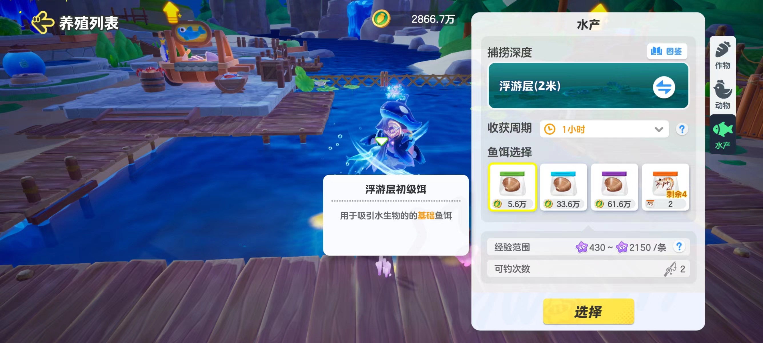 钓鱼前需要选择鱼饵,不同品质的鱼饵,会决定在这个捕捞深度钓上来水生物的稀有程度和获取经验范围。品质越高售价越贵,星宝要按需选择哦!