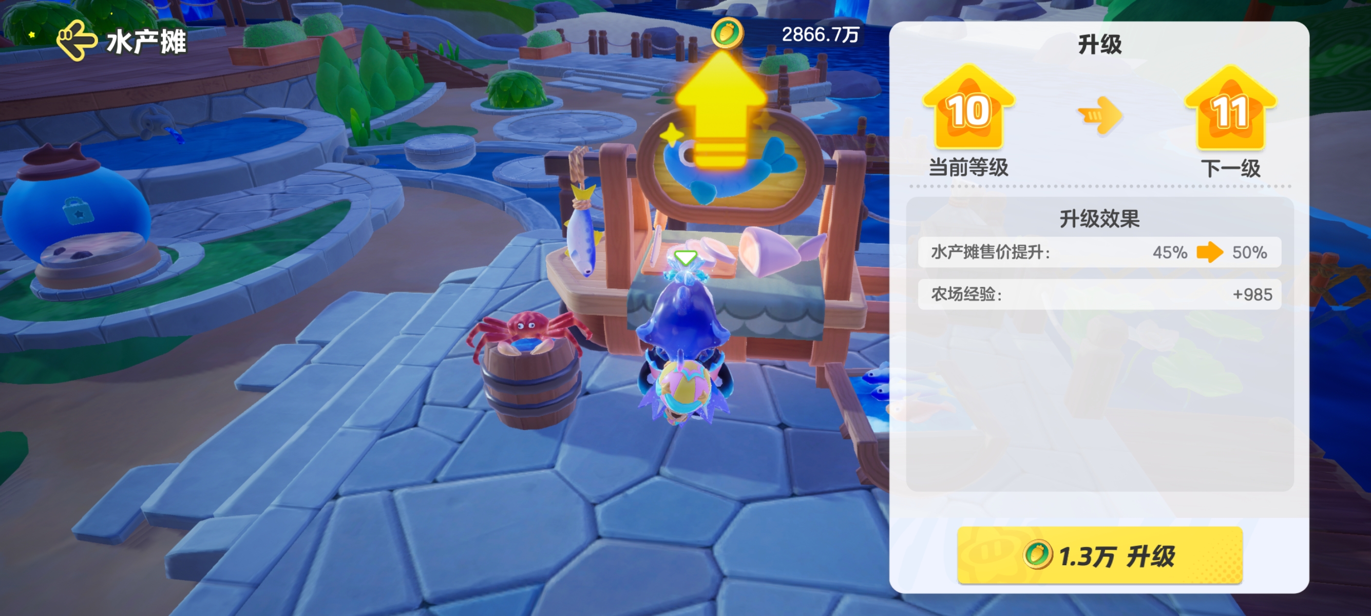 水产摊,就像蔬菜摊与动物小铺~每提升一级,都会增加水产的售价。