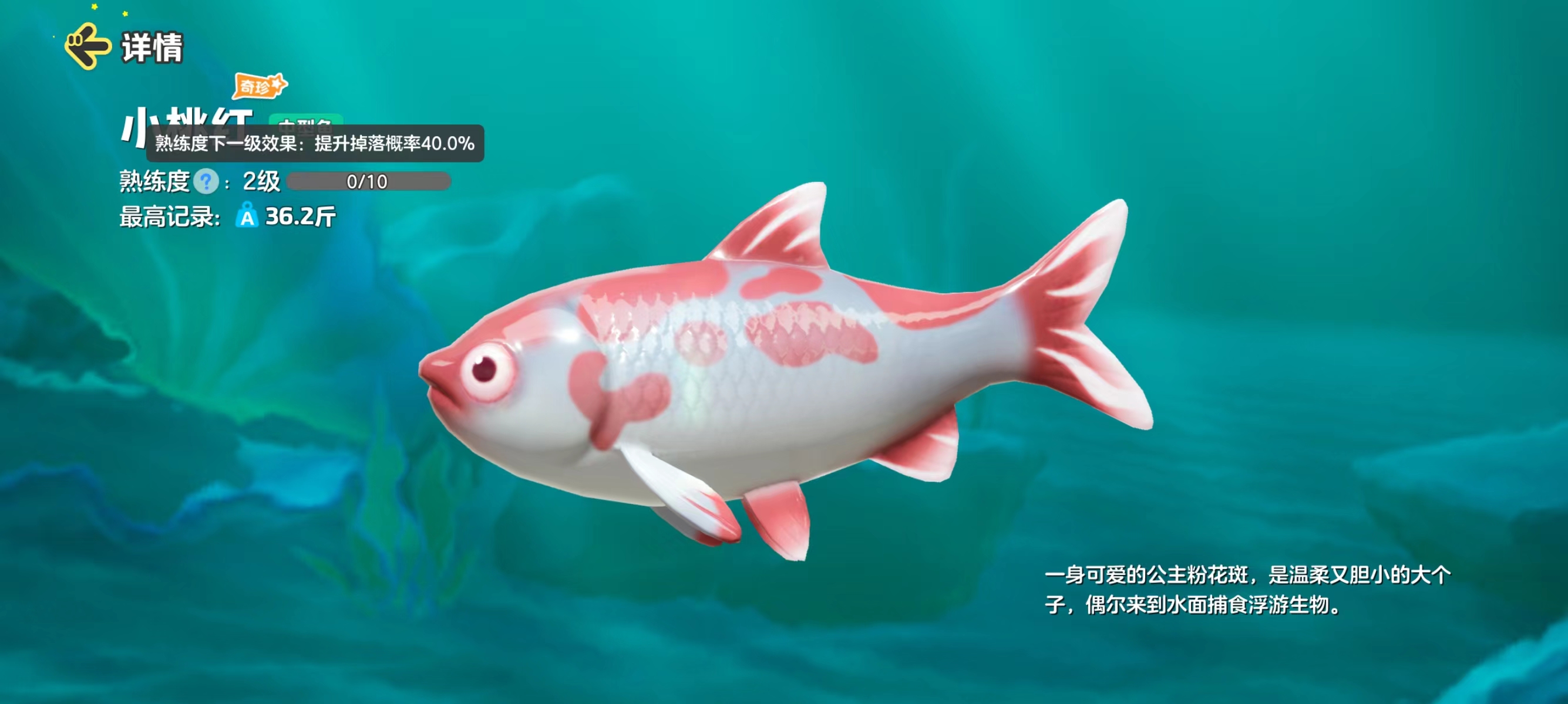 在观看鱼类图鉴的时候,星宝们有没有关注过熟练度一栏呢?每钓到一条鱼,就能为这个水生物增加熟练度,熟练度越高,钓到此品种水生物的概率就越高。
