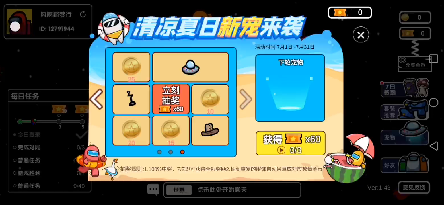 《太空狼人杀》游戏中所有玩家将会被分为船员、背叛者两个阵营,船员阵容将要在整个游戏过程中找出背叛者并将其投票逐出,而背叛者阵容则要找机会制造混乱并分裂、杀死船员们,双方都要在这艘飞船中斗智斗勇,活到最后。 规则介绍:船员(占多数): 1、完成所有任务后游戏胜利(当船员死了,幽灵模式下也可做任务) 2、左上方有进度条,完成任务会涨,涨满则游戏胜利 3、找出隐藏的背叛者并投票逐出,当背叛者全部被淘汰后船员胜利 4、发现尸体或按下紧急按钮后可召开会议,经过讨论后投票淘汰一人 5、如出现紧急时限任务需要及时完成,没有完成则背叛者胜利 船员小技巧: 1、可在监控室(Security)调出摄像头,在管理室(Admin)查看人员分布 2、在其他船员面前做扫描任务会有动画,可证明自己非内鬼3、投票可以根据讨论指定投给某个玩家,也可以在局势不明朗的时候跳过投票 目前已推出可保留存档的新版本,存档保存在云端,更换手机,卸载游戏不再愁!即使卸载游戏、233乐园或更换手机,只要登录233账号,下次游戏还可继承存档!宠物、皮肤、金币不再丢!!!