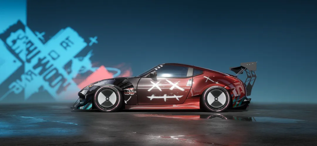 采用了红色的故障像素效果,仿佛在诉说着赛车不羁的个性和对速度的渴望。