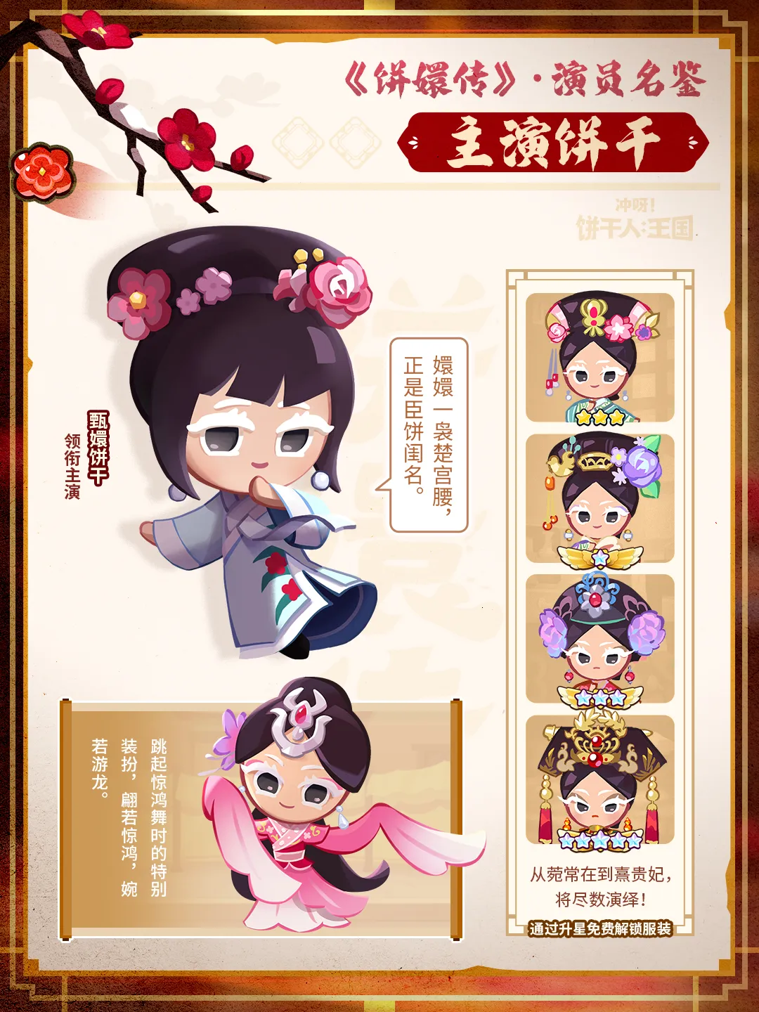 在本次联动期间内,于游戏内达成对应条件,将必定获得联动限定「甄嬛饼干」(可上场作战),让饼干朋友们都能一览惊鸿舞的翩翩姿态!还请关注近期的最新情报~
