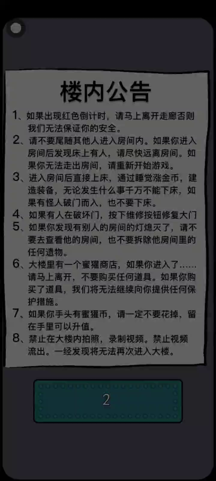 《猛鬼宿舍》是一款2D塔防小游戏。游戏中玩家需躲避猛鬼的追捕,寻找适合自己的宿舍躲避,并发展经济建造炮台,抵御猛鬼。游戏中玩家只可以在房间中的空地板上进行建造,玩家点击空地板后,出现建筑菜单。游戏中玩家需要根据自己当前的经济选择性建造建筑,发现一条符合自己发展的道路。玩家需要将鬼击败或者抵御至天亮方可获胜,反之鬼抓到玩家则玩家失败。