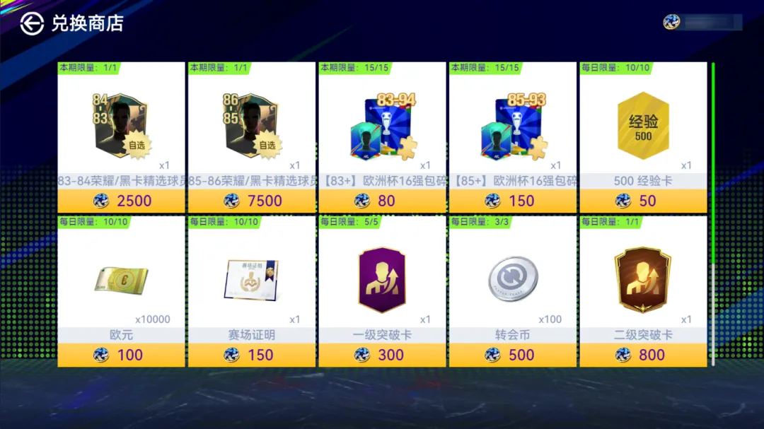本期奖励强势升级,特别上线83-84、85-86荣耀/黑卡精选球员自选包!同时也可兑换欧洲杯16强球员包碎片、经验卡、欧元、经纪人合同等奖励~
