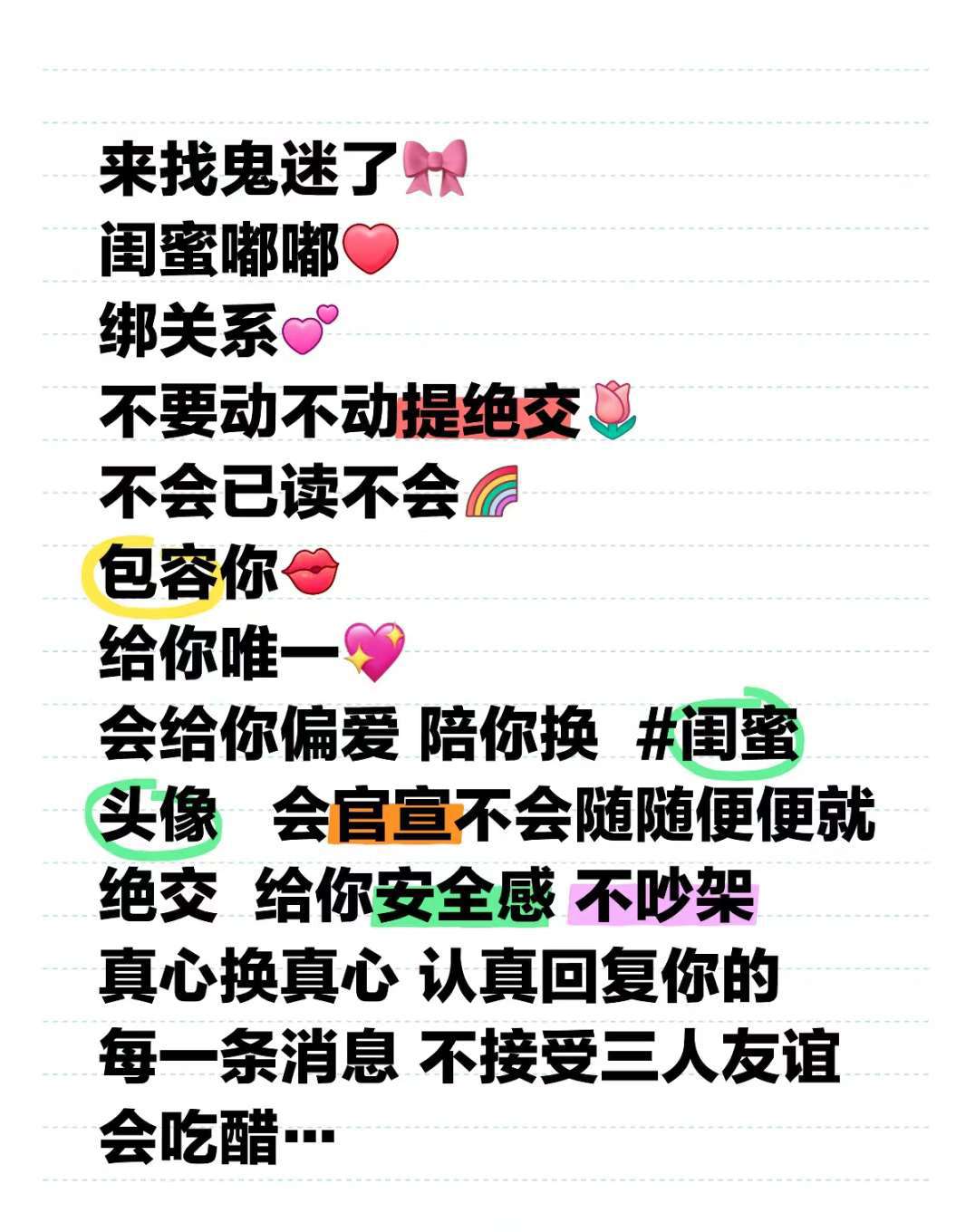 荞麦y🌿. 闺蜜嘟嘟 绑关系 不要动不动提绝交 不会已读不会 包容你 给你唯一💖 给你偏爱😘