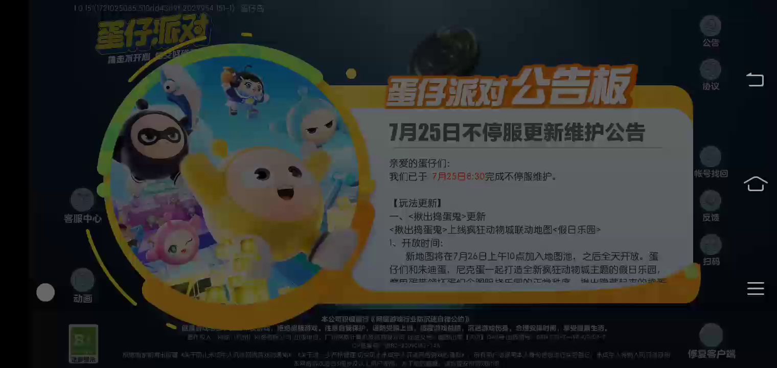 【较旧的游戏版本可能遇到无法充值问题,请更新游戏版本后再次尝试,给您带来的不便敬请谅解。】 《蛋仔派对》7月26日暑期版本《疯狂动物城》联动即将重磅开启,<芬尼克小象服>外观免费领! *<萌蛋破译><萌蛋推演>盲盒返场,有机会获得“第五人格自选盲盒”!* *<乐迷艾可>盲盒上新,抽奖得典藏外观<乐迷艾可>和典藏配饰* *<星座背饰梦幻购>活动开启,仅需6元即可获得,活动期间更有6枚彩虹币福利* *<狂欢星期六>免费领彩虹币宝箱、表情<因为他善>* 【黄金盛宴开启,恶人全员齐聚!】 全新派对季“深海逐金宴”开启,关注这场危险重重的黄金盛宴,猜测最后的赢家,探寻黄金的秘密,逃出深海,重获自由! 【全新关卡 深海的奥秘等你探寻】 跟随洋流穿梭于海底,躲避贝壳障碍;坐着魔鬼鱼顺水而行,参观海星与海螺的海洋美景;和剧毒的水母做游戏,在珊瑚礁间躲避放电的海葵;深海寻宝,与珍珠来一次亲密接触;在沉船中追逐黄金,从深海章鱼的触手中逃脱险境! 【派对季盲盒 全新来袭】 深海“恶人”集结!与海豚作伴,自由自在的怪盗大小姐——浪花黛露珊;昔日海上富商,风度翩翩的西装“暴徒”——大亨波利;行于黑暗,神秘莫测的致命行者——幽猎塞莉诺,还有“笑面虎”古董商叨爷;“铁憨憨”拳手迦克;“欺诈师”发牌员贝丽丝……这些赴宴者各怀鬼胎,却对黄金势在必得。 【全新派对季 福利多多】 1.参与全新派对季的活跃任务,潜入深海,探索黄金的秘密,即可解锁深海中的奇遇探险“潜海探险家”外观; 2.派对季段位重置,挑战段位任务获得“雪豹阿啸”、“洋流海龟”外观。 3.完成本派对季派对手册任务,即可获得“流浪寄居蟹”、“沙雕堡垒”等外观;