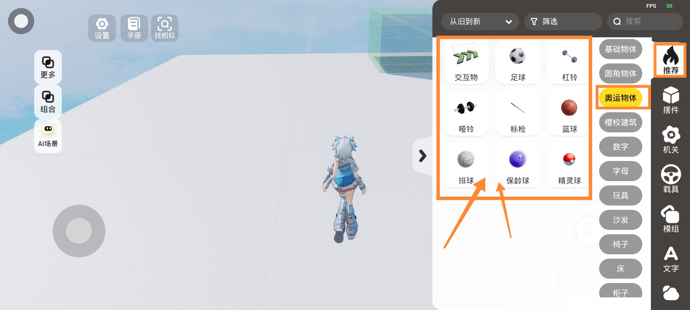 在【推荐】-【奥运物体】,可以看到新增的交互物、足球、杠铃、哑铃、标枪、篮球、排球、保龄球、精灵球~