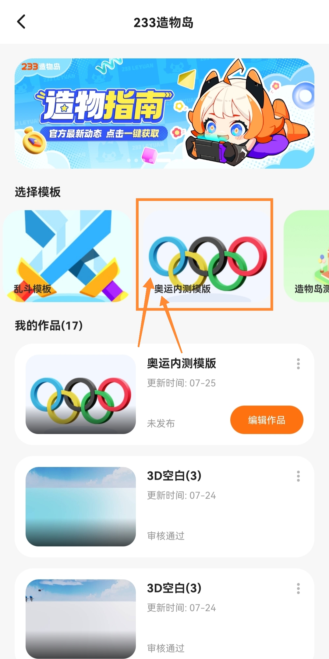 哈喽各位造物岛先遣小队的队员们,造物岛内测版本已经可以开始体验啦!本次开启内测的是奥运内测模板。