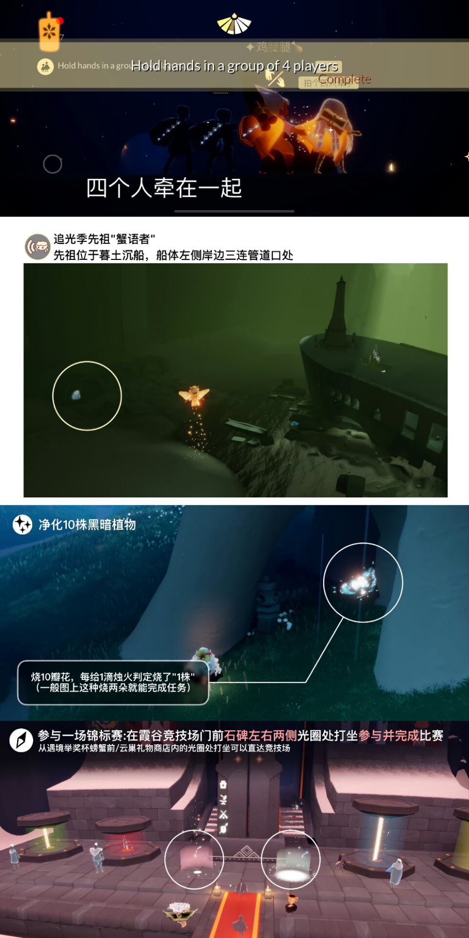 「四人牵手组队」四个人牵在一起,也可通过在【霞谷表演季剧场右边洞口的火盆旁】或【禁阁庇护所向导对面方罐子旁】打坐重温对应季节任务完成。
