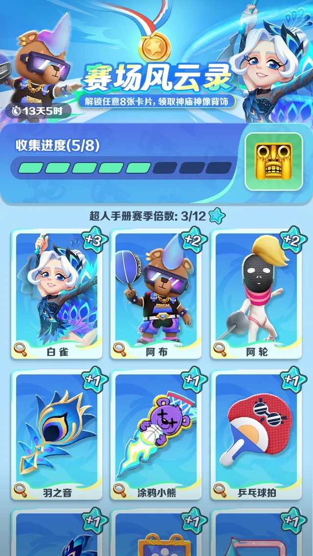 🎐每获得一个深圳版本角色/背饰/滑板即可解锁对应卡牌,任意解锁8个卡牌即可获得神庙神像背饰