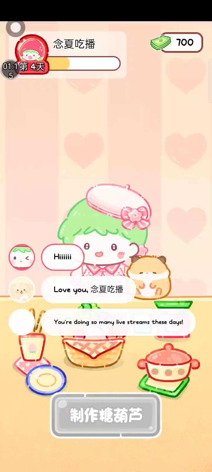 更新宠物!!! 「你进行草莓糖葫芦吃播的话,我就赞助100元。」 「脆口的声音太迷人了(°θ°)」 由于客人都被最近新开的许多糖葫芦店家抢走,曾经号称糖葫芦达人的父母因此卧病在床。 继承父母店面的主角露露开始糖葫芦吃播来宣传店面。 直到成为真正的糖葫芦达人那一天! 「今天我也要开始糖葫芦直播罗!( •o• )」 [串材料] 只有新鲜的水果的话,很难以一名吃播实况主存活下来。还要有松饼、地球软糖、青阳辣椒!利用奇特的材料制作糖葫芦吧。 [裹糖衣] 将材料串满竹签的话,就放进锅子搅动吧。唯有利用达人的秘法,才能裹出又薄又脆的糖衣。 [即时吃播] 咔哒咔哒!今天的吃播也大成功。热烈的聊天内容看起来反应也不错。看来得利用完成观众任务得到的赞助金来买新材料了! 来,准备好了吧?现在就马上挑战成为糖葫芦达人吧!