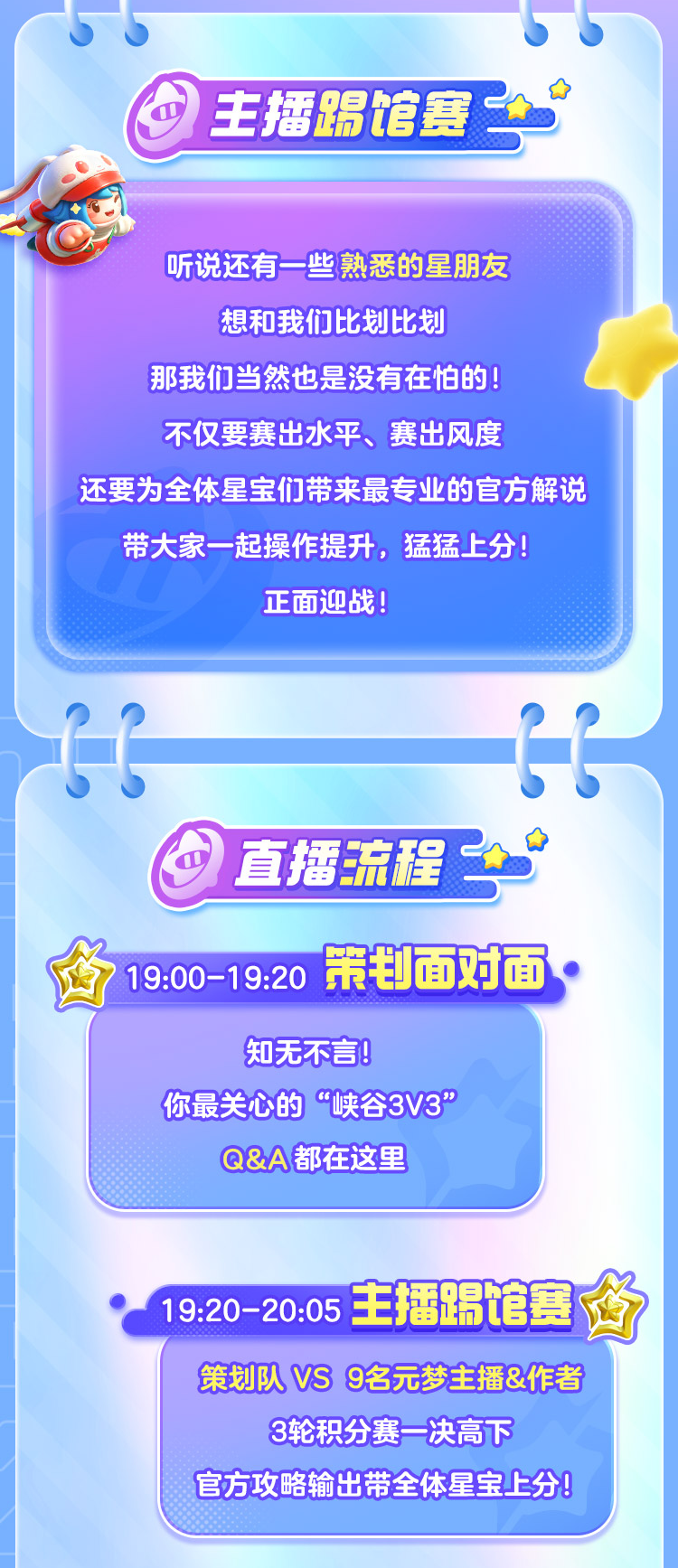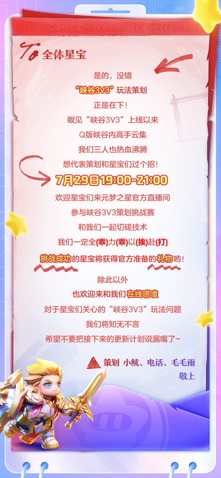 策划大神,等你来战!7月29日19:00-21:00峡谷3V3策划挑战赛正式开始!不仅可以切磋技术,还可以和策划们在线唠嗑噢~你最关心的峡谷3V3 Q&A策划大大知无不言!挑战成功的星宝还将获得官方准备的礼物哦~请前往各大平台元梦之星官号预约直播,更多精彩锁定元梦之星官方直播间!
