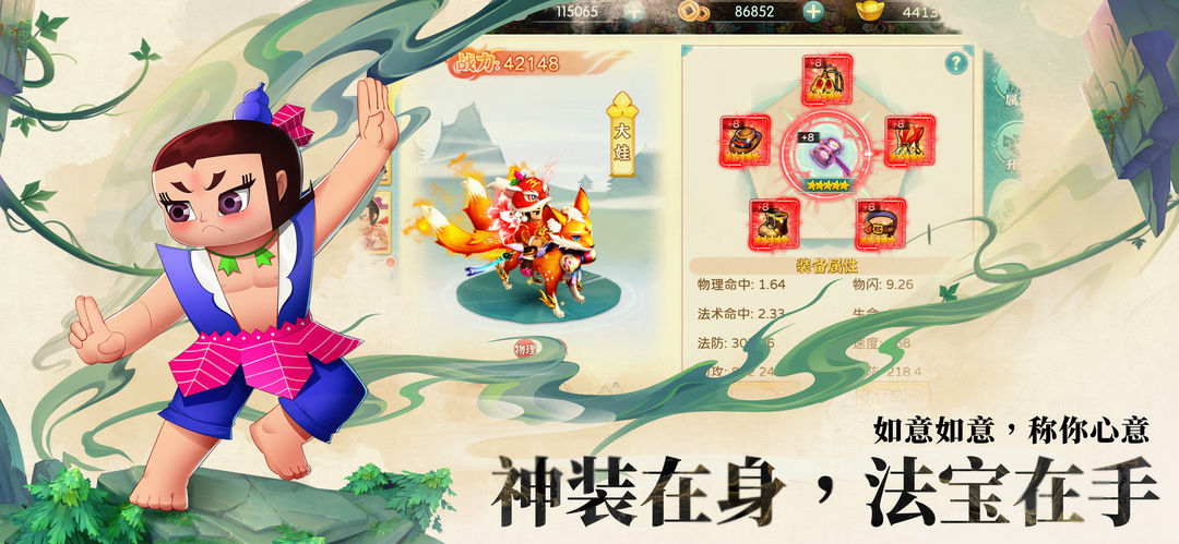 战斗中得心应手的兵器也同样是制胜的关键,在《葫芦娃·奇幻世界》中,大量的神装、法宝任你搭配,神装不论是凑成套装追求特殊效果,还是灵活搭配追求最高的属性,都会直接影响战斗玩法和结果,战斗趣味性策略性拉满。而法宝系统让葫芦兄弟们如虎添翼,独立于卡牌战斗外的法宝释放系统,让战局瞬息万变,每一次法宝的释放都会带来扭转战斗的机会,体验真正刺激紧张的策略战斗。