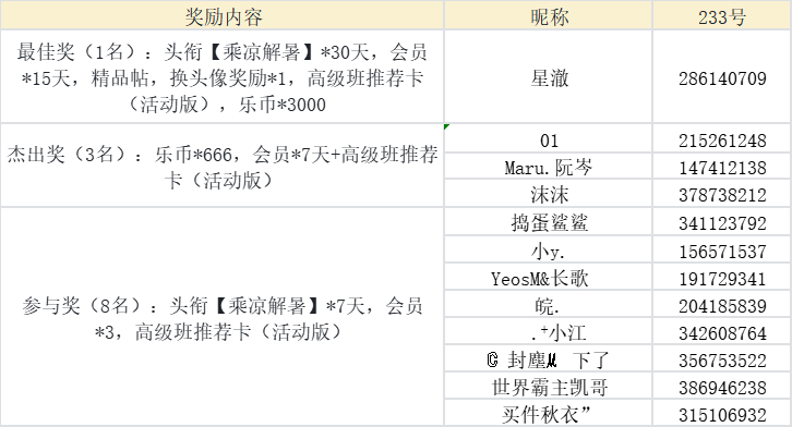 最佳奖(1名):头衔【乘凉解暑】*30天,会员*15天,精品帖,换头像奖励*1,高级班推荐卡(活动版),乐币*3000