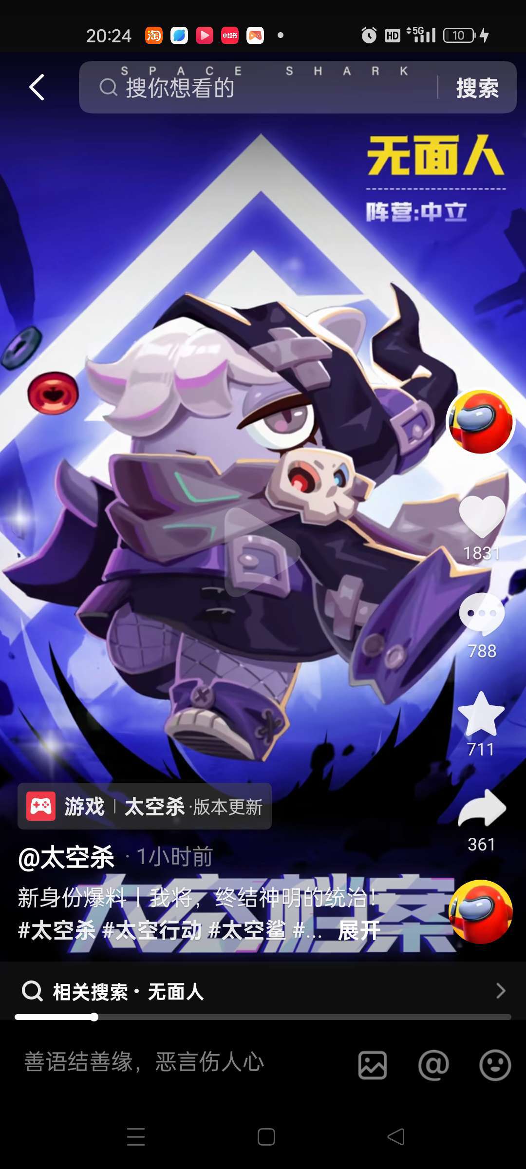 新身份是无面人,自己看抖音。