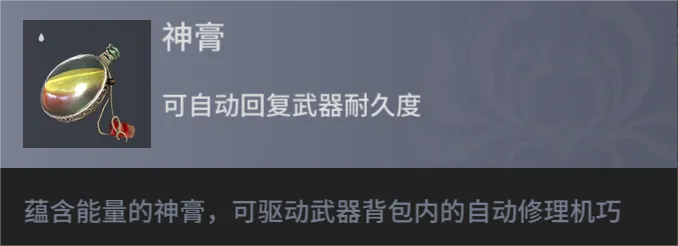 当你的武器累得气喘吁吁,耐久见底时,只需将它放回背包切换为其他有耐久的武器,神膏将会为你自动修复!