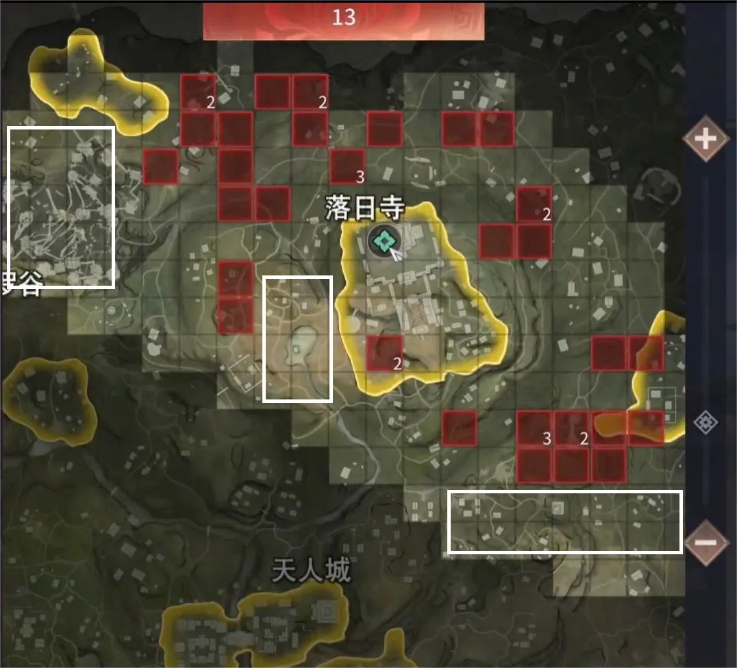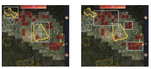 打开地图,黄色区域代表的是高资源区域,红色方块为敌方选择区域,上面的数字代表该跳点有几位强敌等待与你较量。