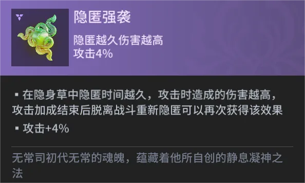 【隐匿强袭】:在隐身草中隐匿时间越久,攻击时造成的伤害越高。