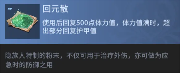 使用回元散可以回复500点体力值,体力值已满时,超出部分将转化为护甲值。