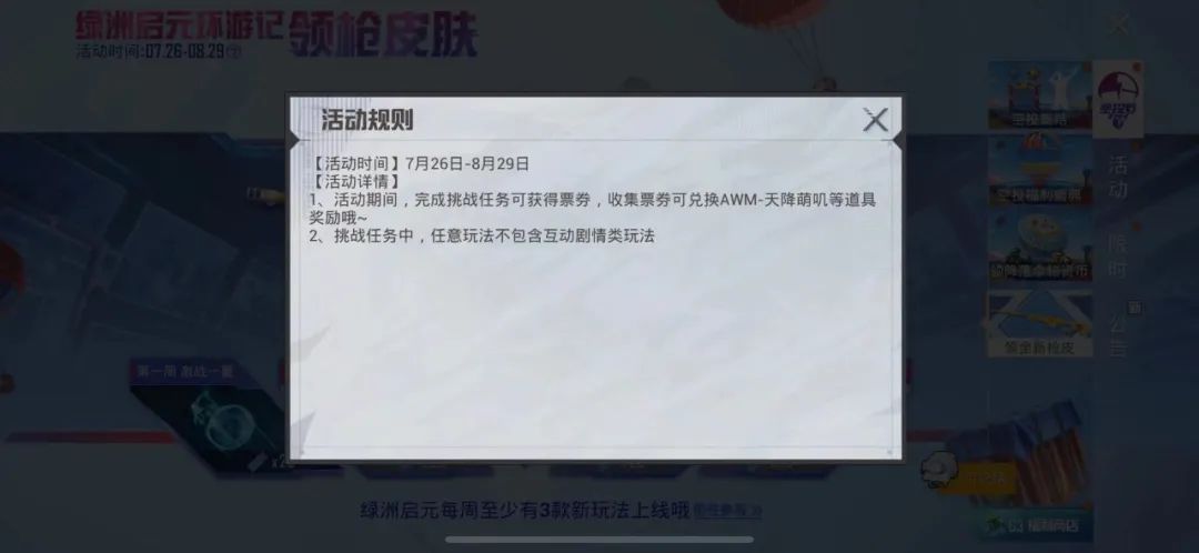 1.参与活动,完成挑战任务,即可赢取丰富票券。收集这些宝贵的票券,就能兑换到AWM-天降萌叽等精美道具,尽享空投福利盛典的豪华大奖!