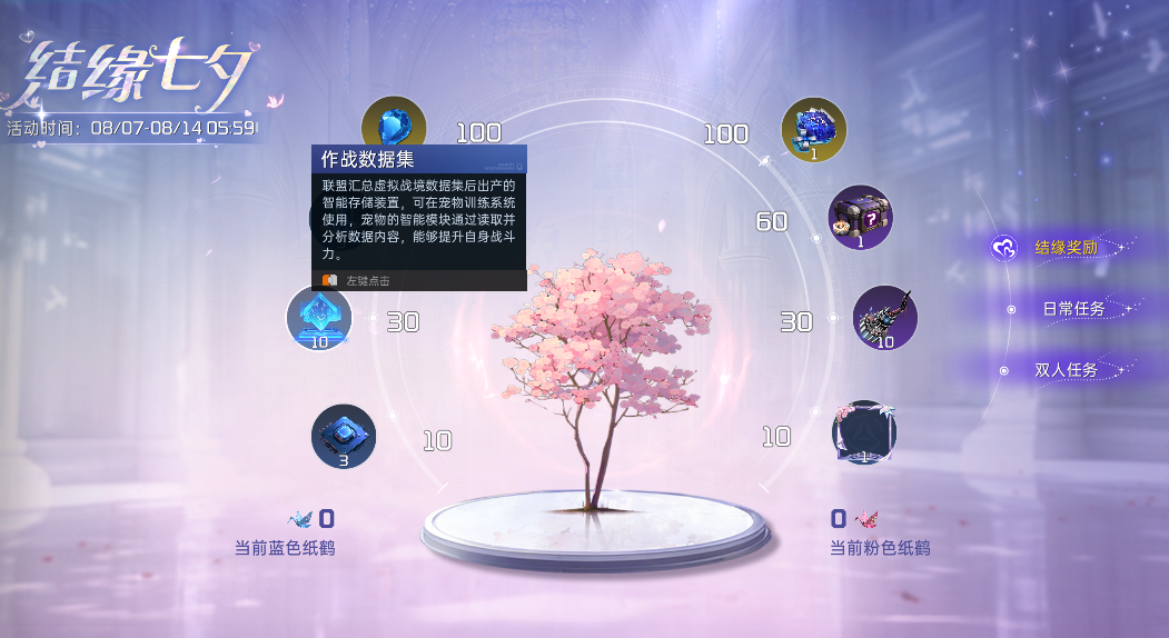 种下一颗爱意的种子,共同见证它的成长!完成日常任务和双人任务可获得不同颜色的纸鹤,收集纸鹤达指定数量,不仅能改变树的形态,还可免费获得鹊桥情缘头像框、稀有机能模块(绑定)、永生蓝莹等结缘奖励哦~