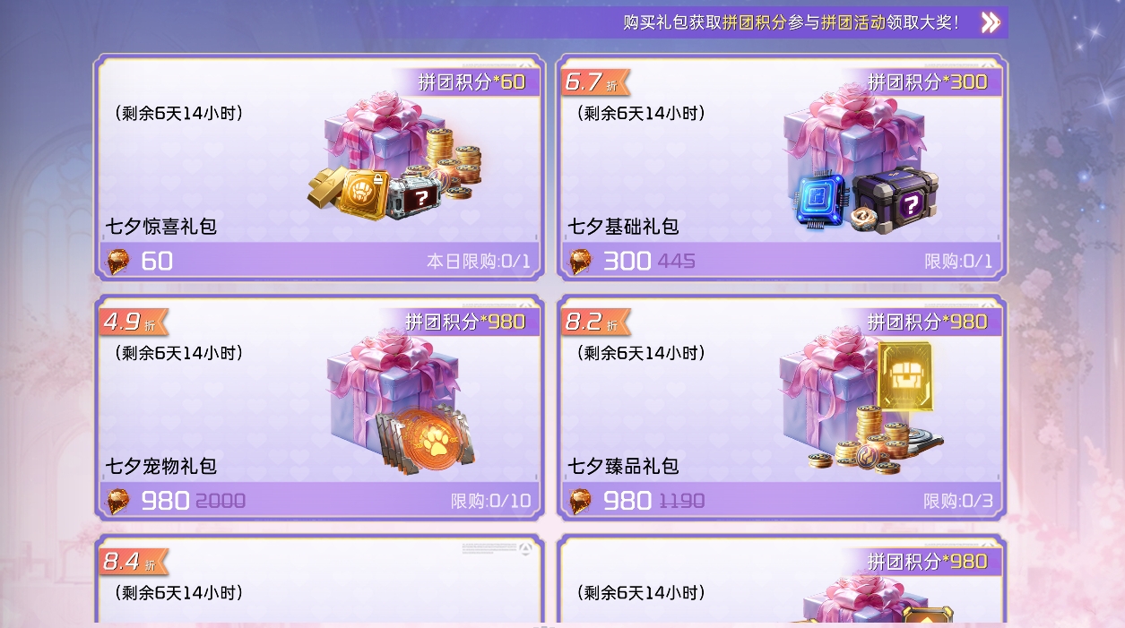 浪漫惊喜不止于此!活动期间,商城将上架一批七夕礼包,让各位在沉浸七夕氛围的同时,还能享受好礼!幸存者们可按需购买,获取拼团积分更可参与拼团活动领取大奖!